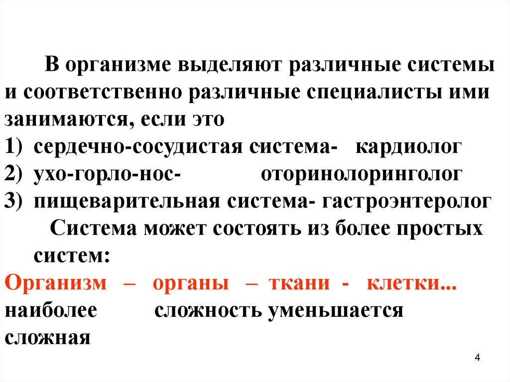 В организме выделяют различные системыи соответственно различные специалисты ими