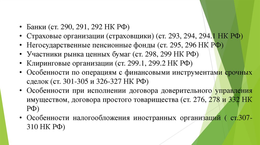 • Банки (cт. 290, 291, 292 НК РФ)• Страховые организации (страховщики) (cт. 293, 294, 294.1 НК РФ)