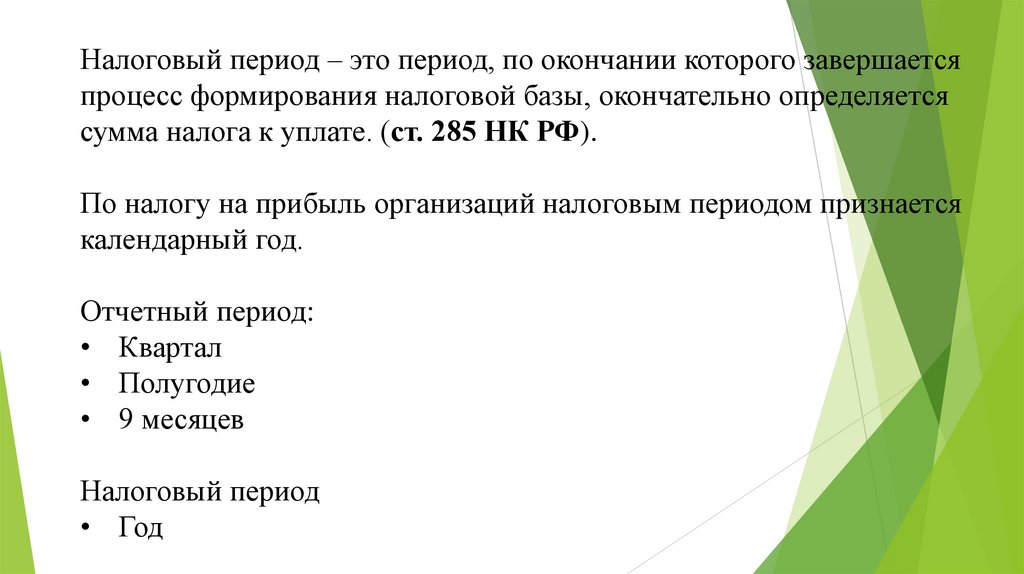 Налоговый период – это период, по окончании которого завершаетсяпроцесс формирования налоговой базы, окончательно определяется