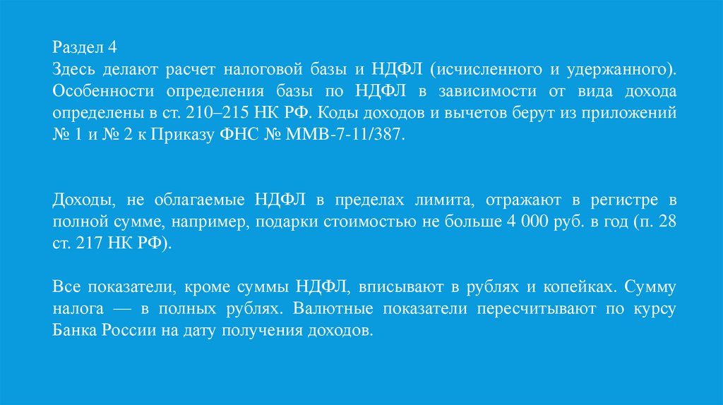 Раздел 4Здесь делают расчет налоговой базы и НДФЛ (исчисленного и удержанного).