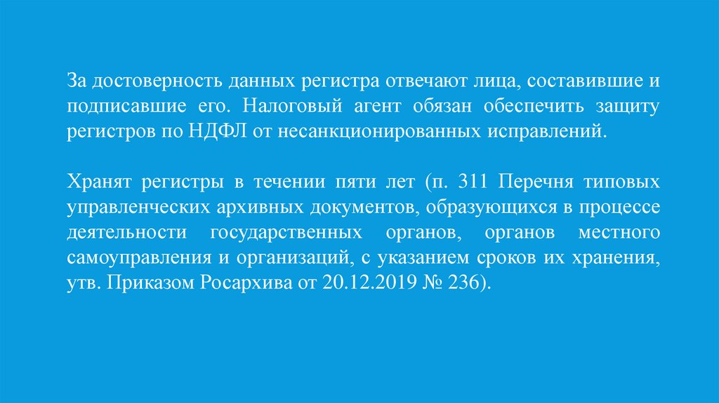 За достоверность данных регистра отвечают лица, составившие иподписавшие его. Налоговый агент обязан обеспечить защиту