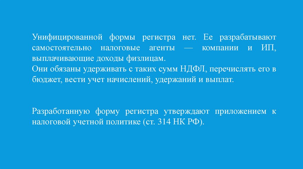 Унифицированной формы регистра нет. Ее разрабатываютсамостоятельно налоговые агенты — компании и ИП,
