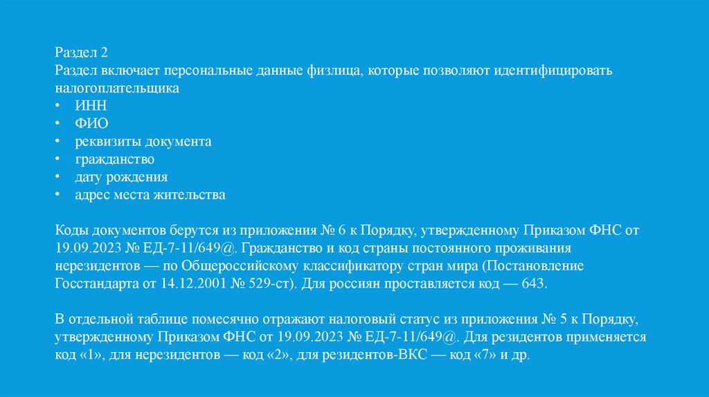 Раздел 2Раздел включает персональные данные физлица, которые позволяют идентифицировать