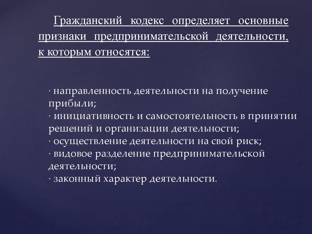 Гражданский кодекс определяет основныепризнаки предпринимательской деятельности,
