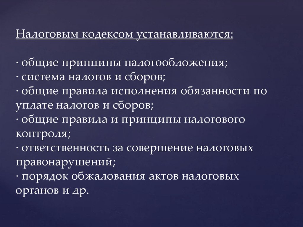Налоговым кодексом устанавливаются:· общие принципы налогообложения;