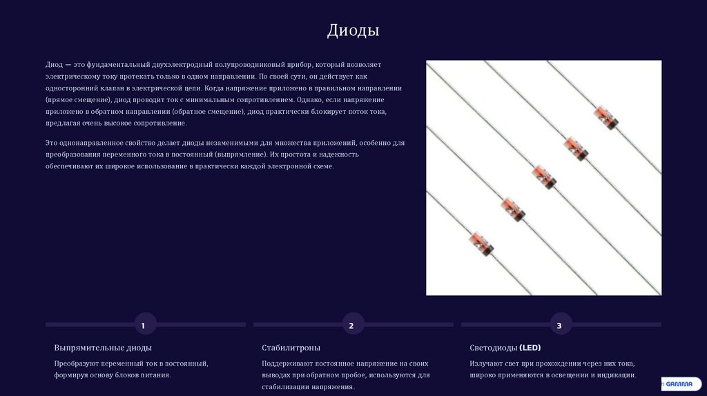 ДиодыДиод — это фундаментальный двухэлектродный полупроводниковый прибор, который позволяет