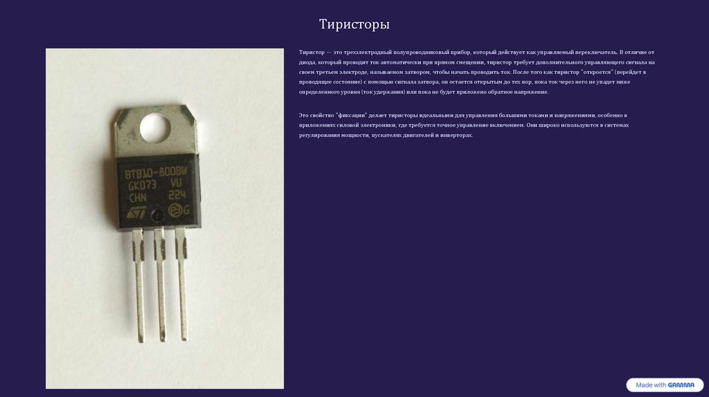 ТиристорыТиристор — это трехэлектродный полупроводниковый прибор, который действует как управляемый переключатель. В отличие от