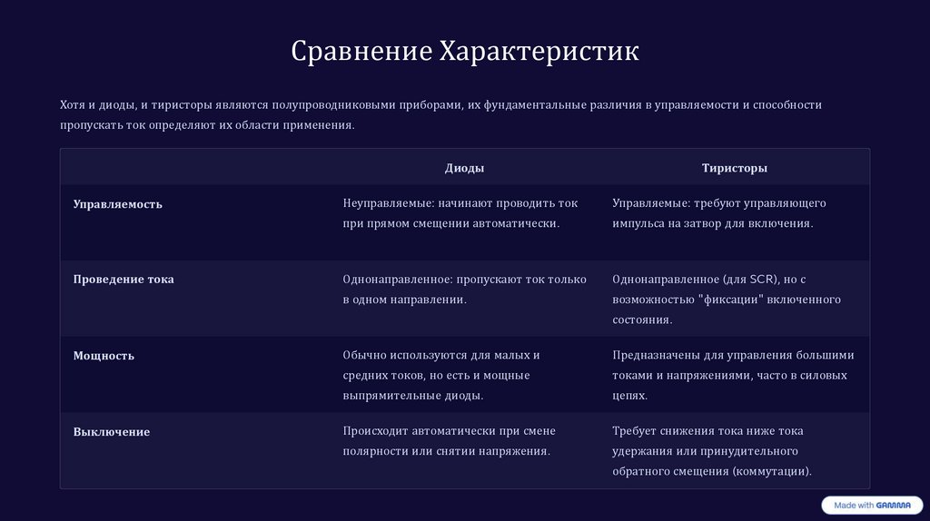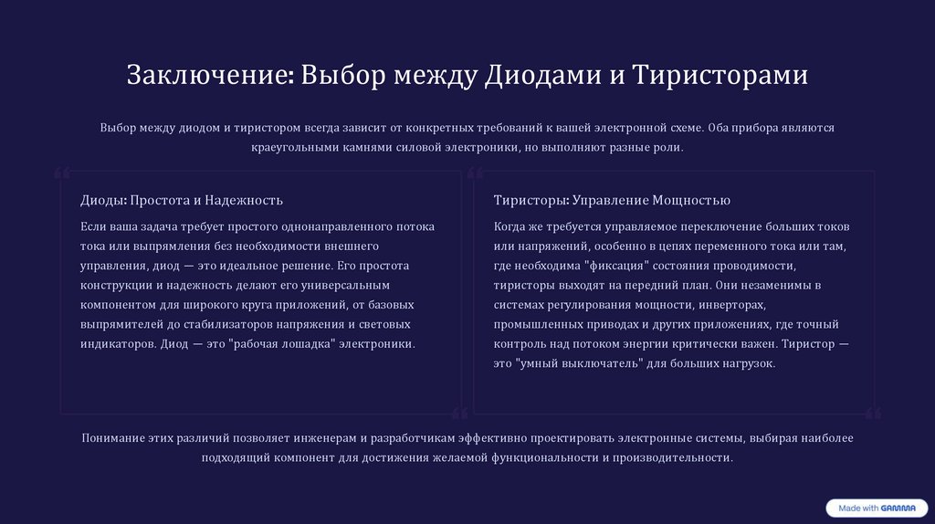 Заключение: Выбор между Диодами и ТиристорамиВыбор между диодом и тиристором всегда зависит от конкретных требований к вашей электронной схеме. Оба прибора являются