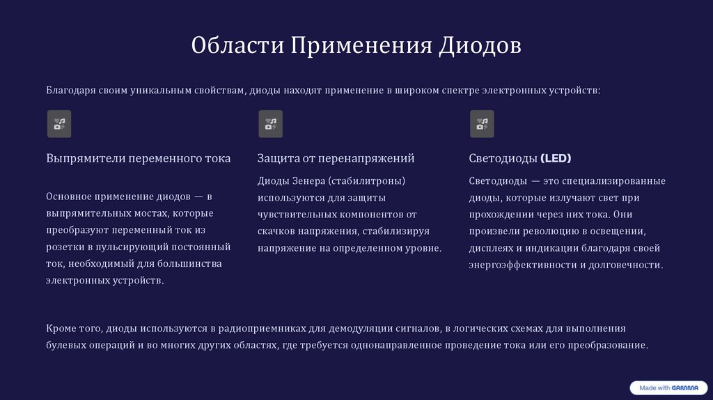 Области Применения ДиодовБлагодаря своим уникальным свойствам, диоды находят применение в широком спектре электронных устройств: