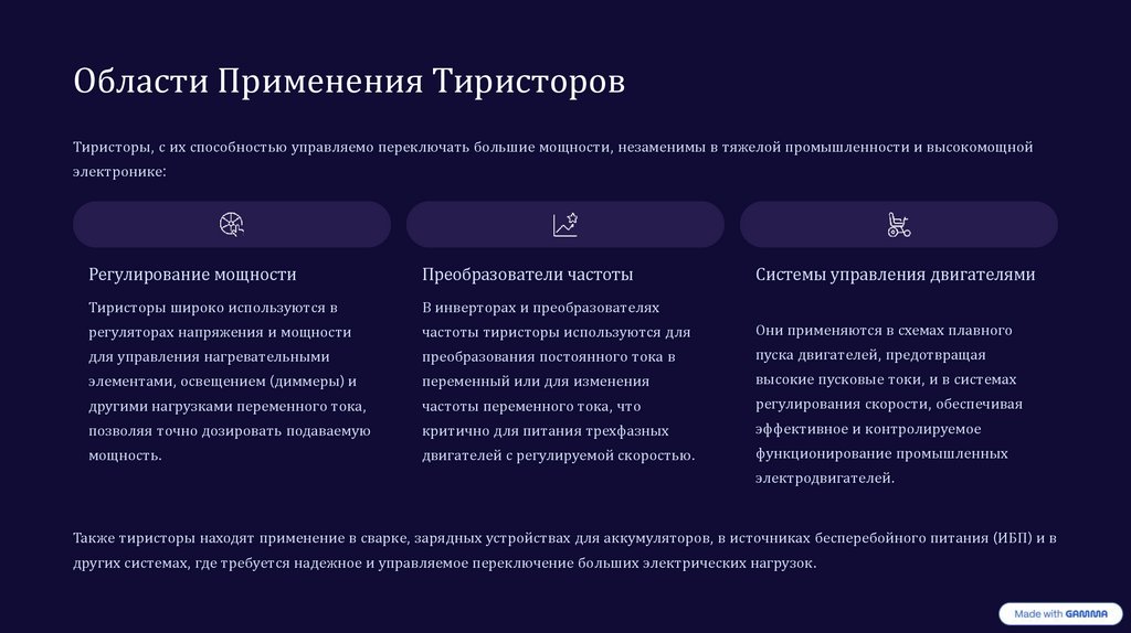 Области Применения ТиристоровТиристоры, с их способностью управляемо переключать большие мощности, незаменимы в тяжелой промышленности и высокомощной