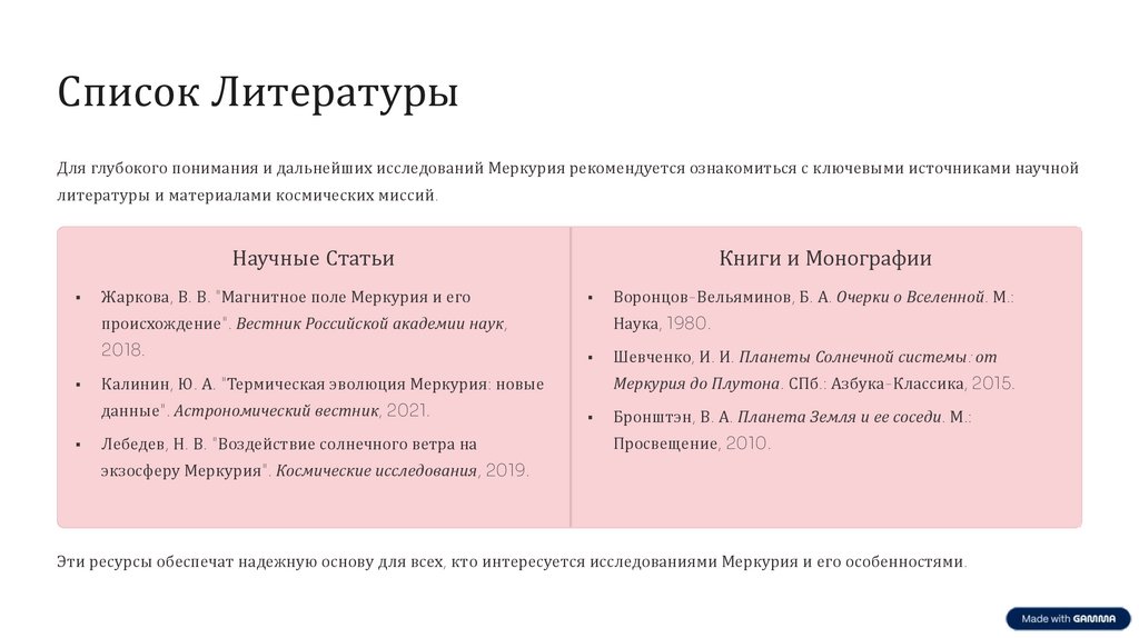 Список ЛитературыДля глубокого понимания и дальнейших исследований Меркурия рекомендуется ознакомиться с ключевыми источниками научной