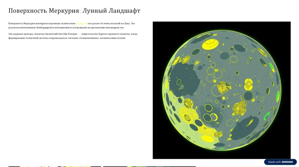 Поверхность Меркурия: Лунный ЛандшафтПоверхность Меркурия испещрена огромным количеством кратеров, что делает её очень похожей на Луну. Это