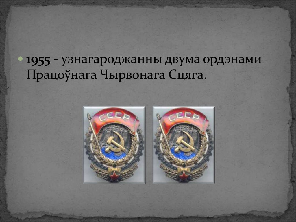 1955 - узнагароджанны двума ордэнамиПрацоўнага Чырвонага Сцяга.