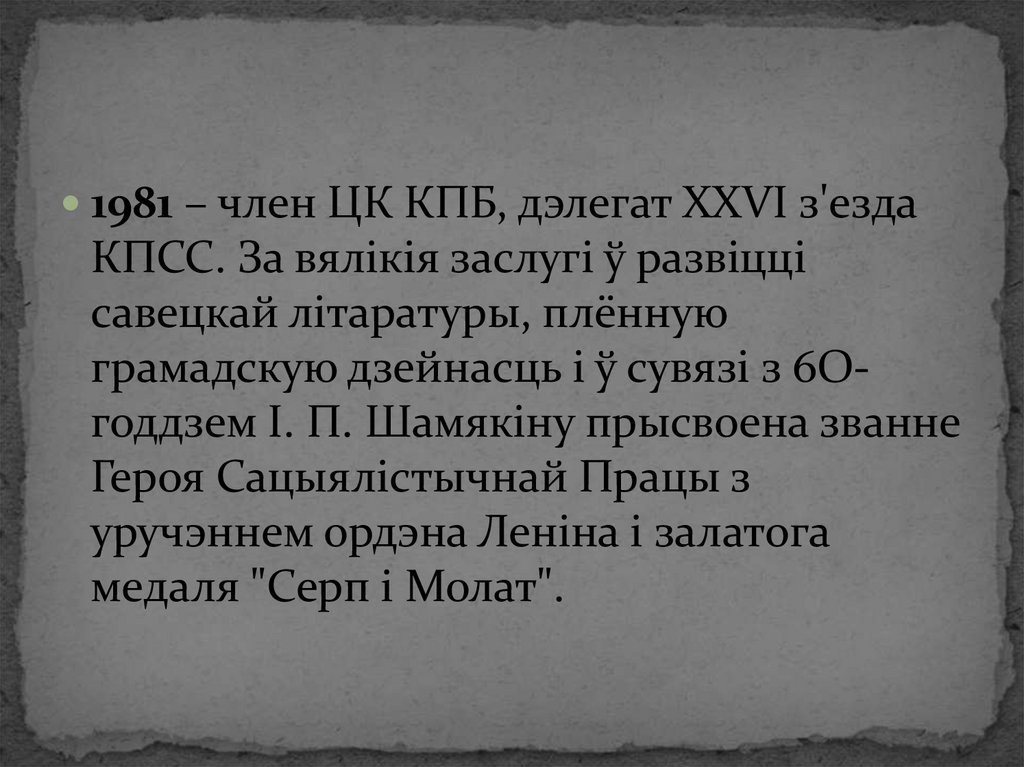 грамадскую дзейнасць і ў сувязі з 6Огоддзем І. П. Шамякіну прысвоена званне