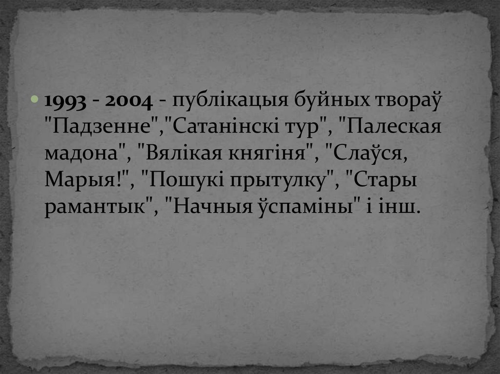 1993 - 2004 - публікацыя буйных твораў"Падзенне","Сатанінскі тур", "Палеская
