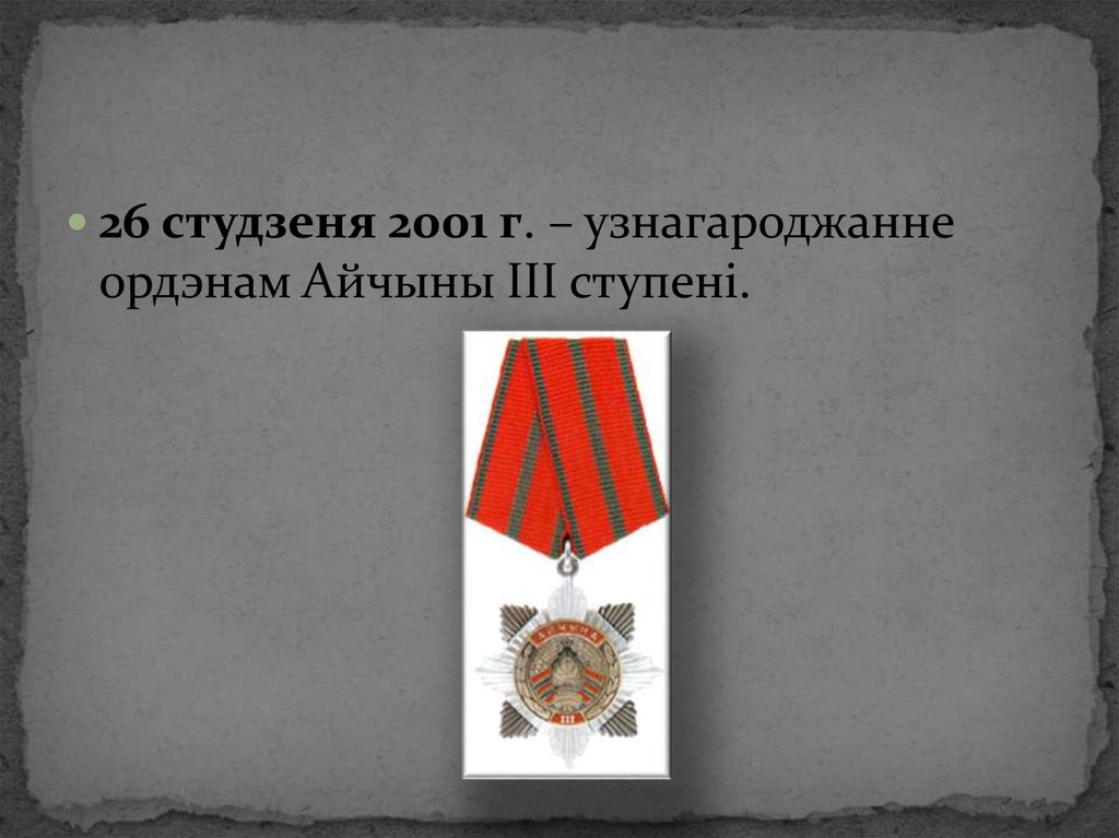 26 студзеня 2001 г. – узнагароджаннеордэнам Айчыны ІІІ ступені.