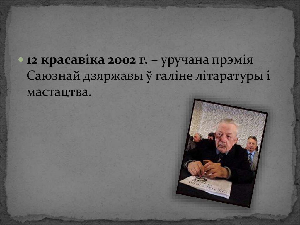 12 красавіка 2002 г. – уручана прэміяСаюзнай дзяржавы ў галіне літаратуры і