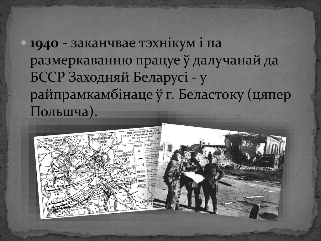 1940 - заканчвае тэхнікум і паразмеркаванню працуе ў далучанай да