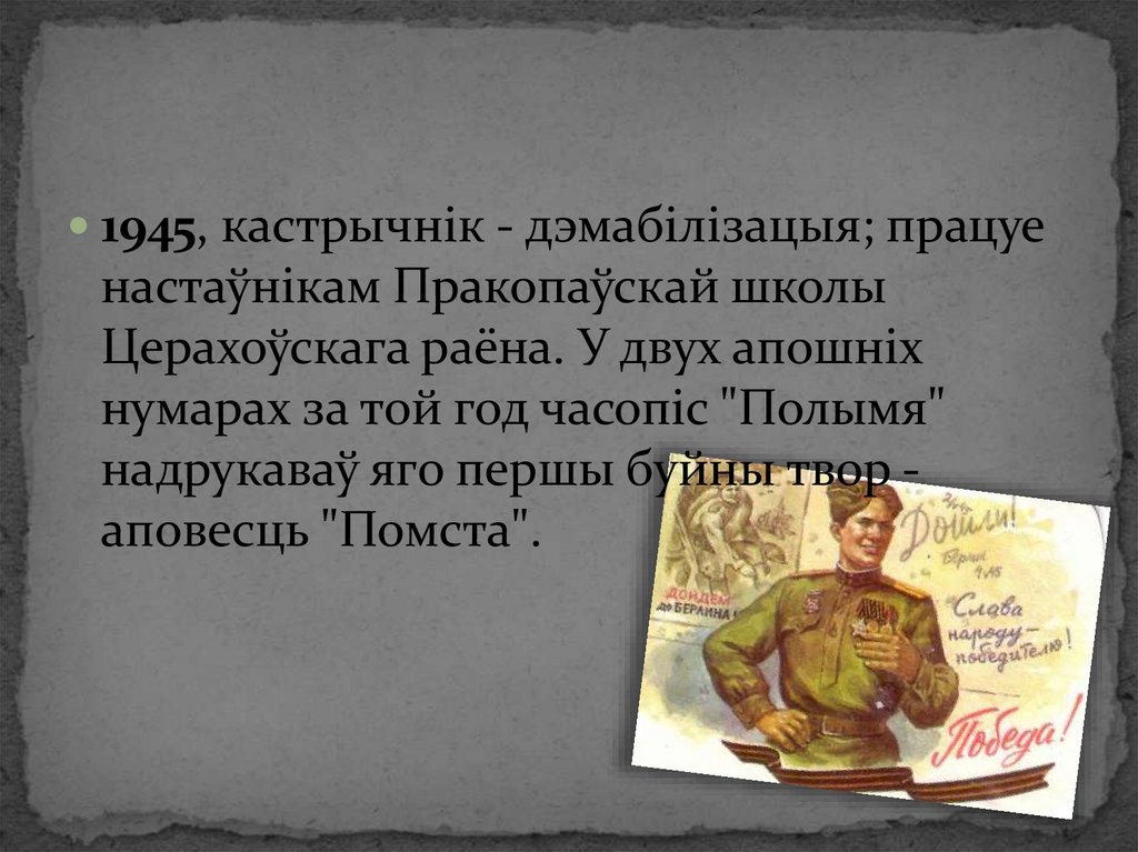 1945, кастрычнік - дэмабілізацыя; працуенастаўнікам Пракопаўскай школы