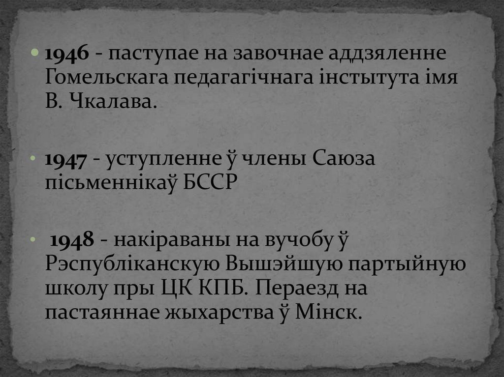 1946 - паступае на завочнае аддзяленнеГомельскага педагагічнага інстытута імя