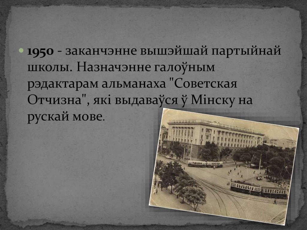 1950 - заканчэнне вышэйшай партыйнайшколы. Назначэнне галоўным
