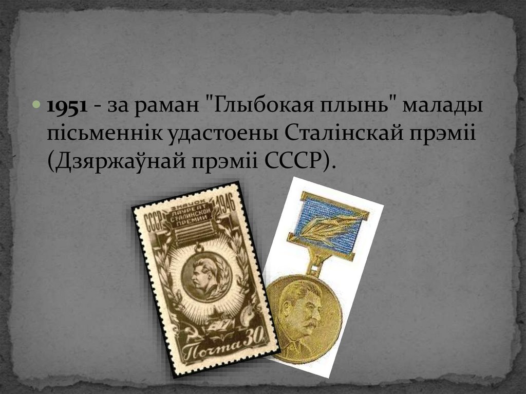 1951 - за раман "Глыбокая плынь" маладыпісьменнік удастоены Сталінскай прэміі