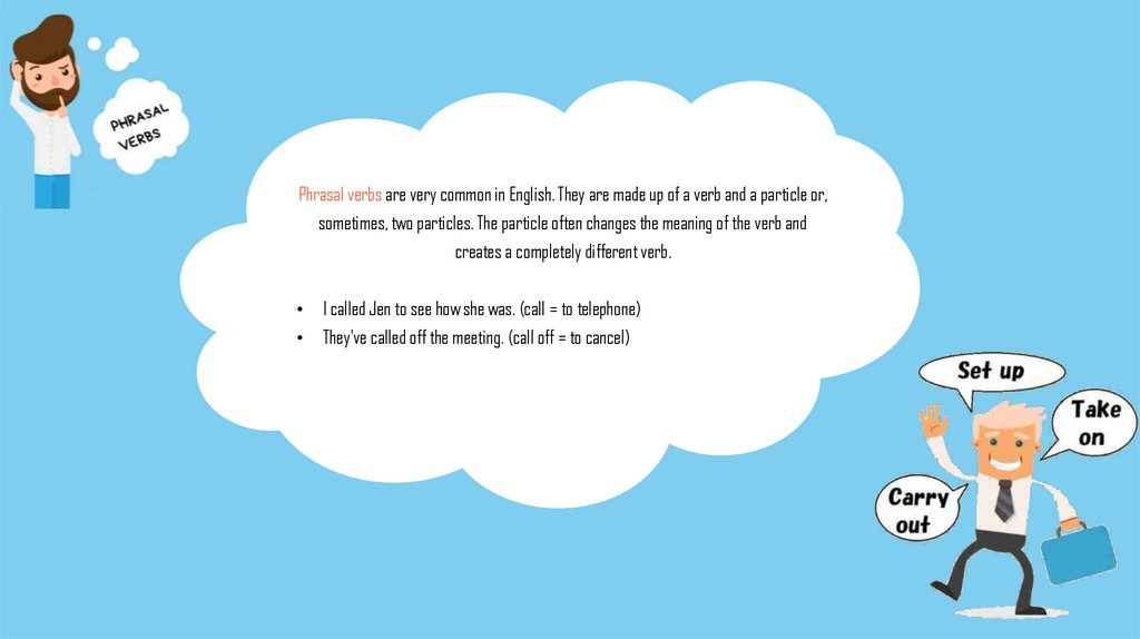 Phrasal verbs are very common in English. They are made up of a verb and a particle or,sometimes, two particles. The particle often changes the meaning of the verb and