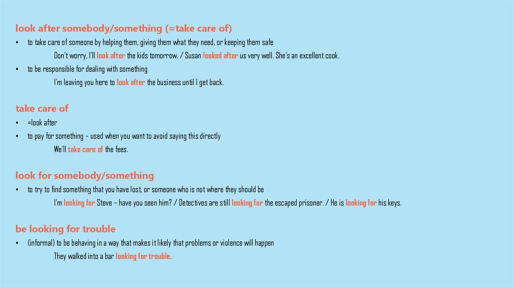 look after somebody/something (=take care of)to take care of someone by helping them, giving them what they need, or keeping them safe
