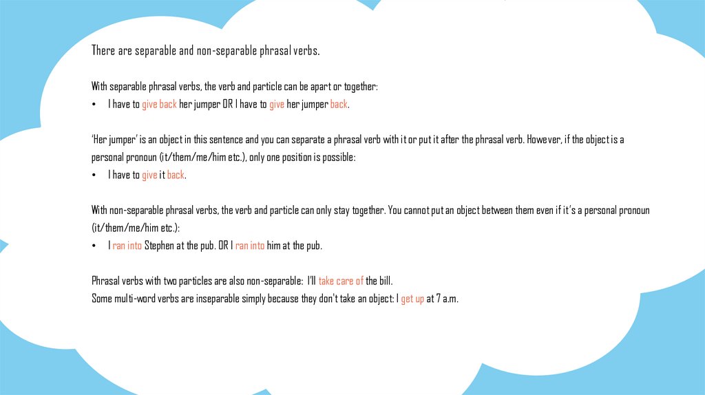 Phrasal verbs with two particles are also non-separable: I’ll take care of the bill.