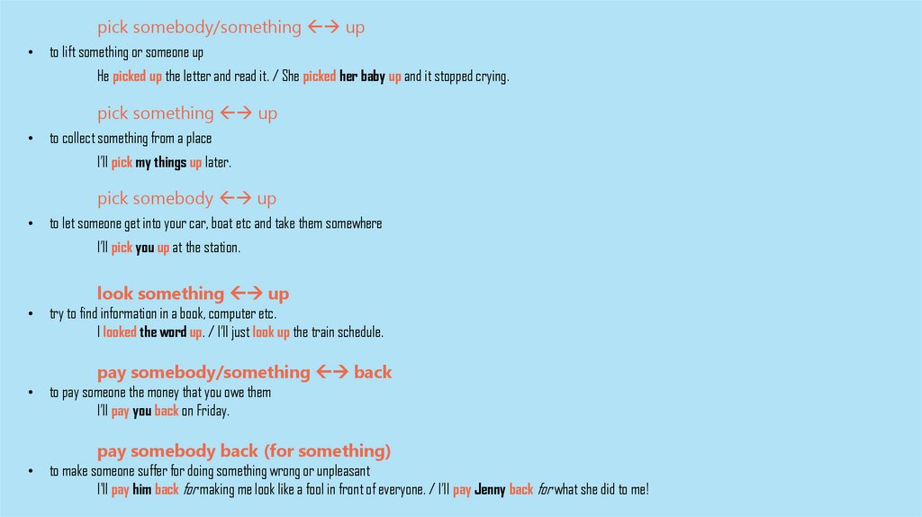 He picked up the letter and read it. / She picked her baby up and it stopped crying.