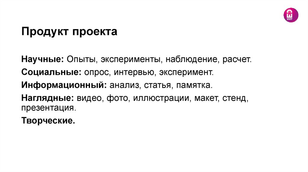 социальный, нацелен на социальные интересы самихучастников проекта или внешнего заказчика. Продукт
