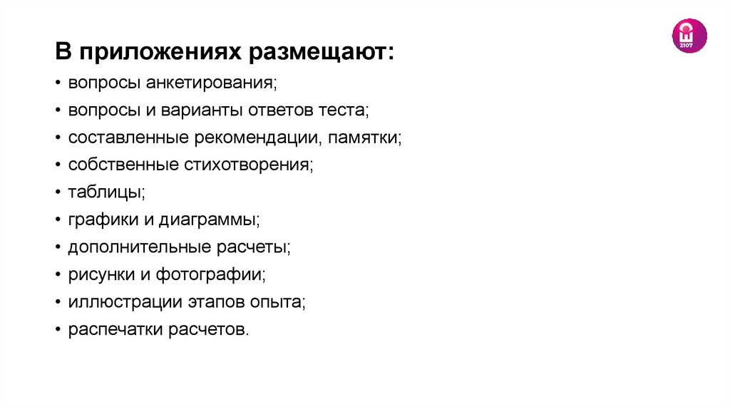 Приложения проекта помещаются на отдельных листахпосле Списка литературы.