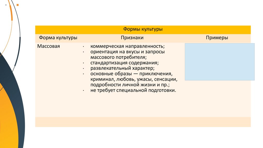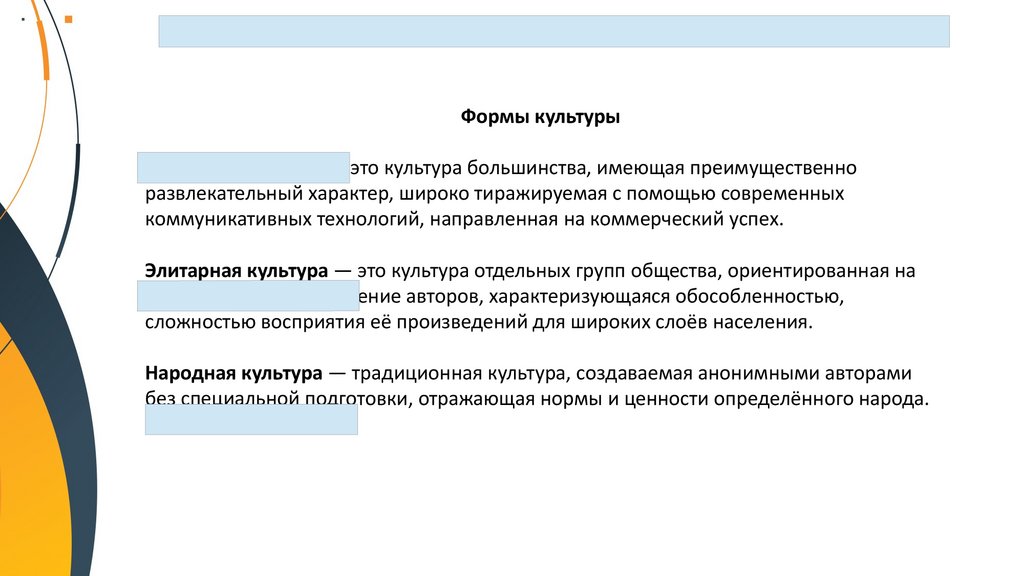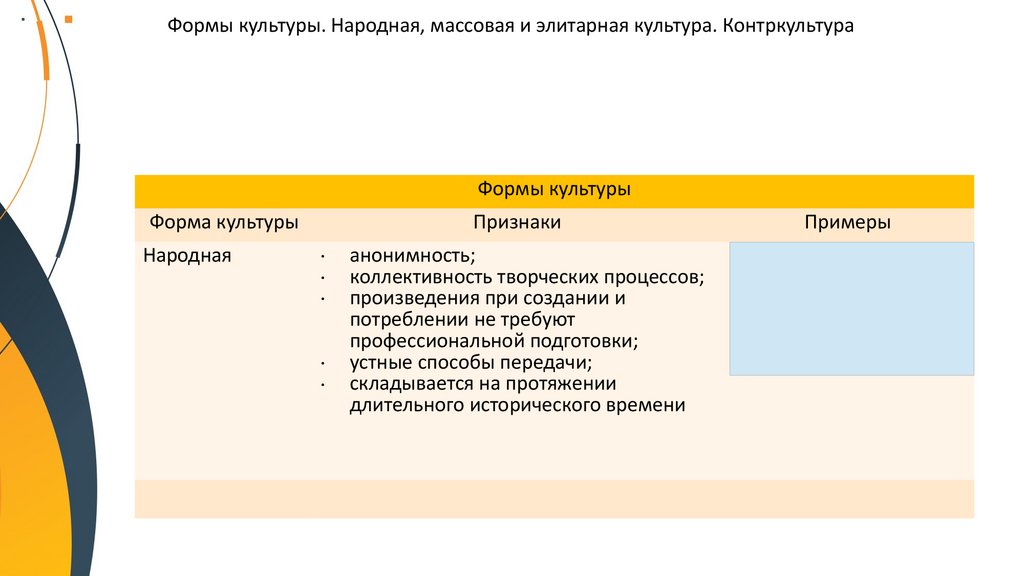 Формы культуры. Народная, массовая и элитарная культура. КонтркультураФормы культуры