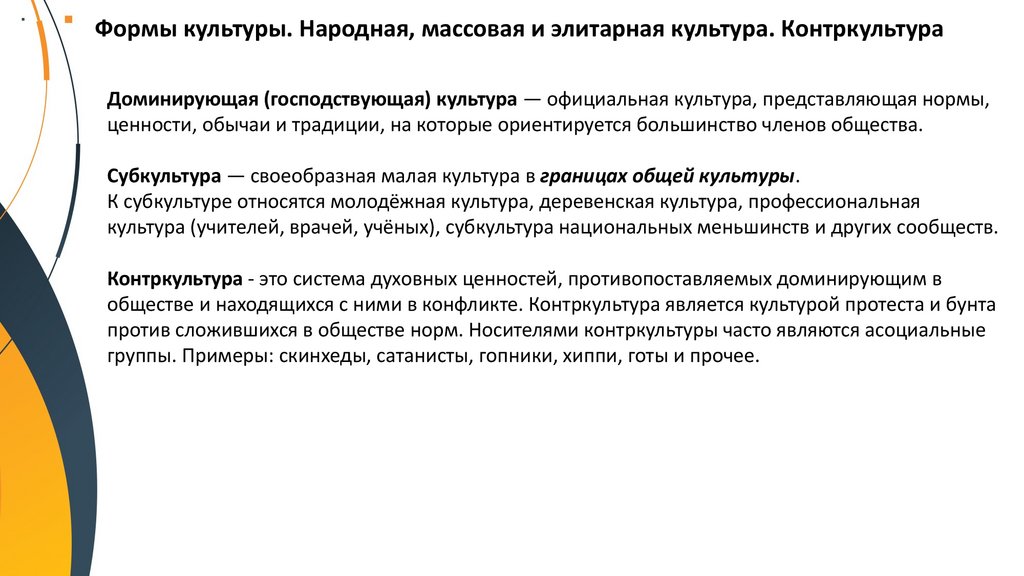 Формы культуры. Народная, массовая и элитарная культура. КонтркультураДоминирующая (господствующая) культура — официальная культура, представляющая нормы,