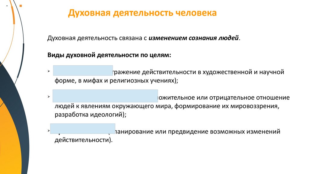 Духовная деятельность человекаДуховная деятельность связана с изменением сознания людей.