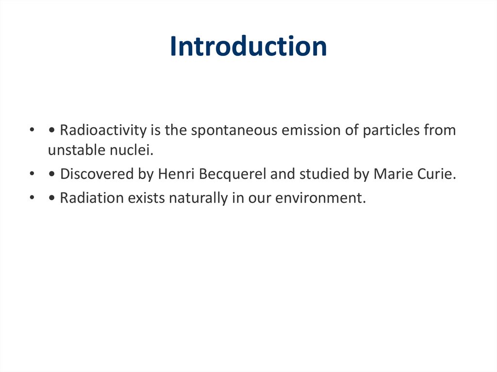 Introduction• • Radioactivity is the spontaneous emission of particles from