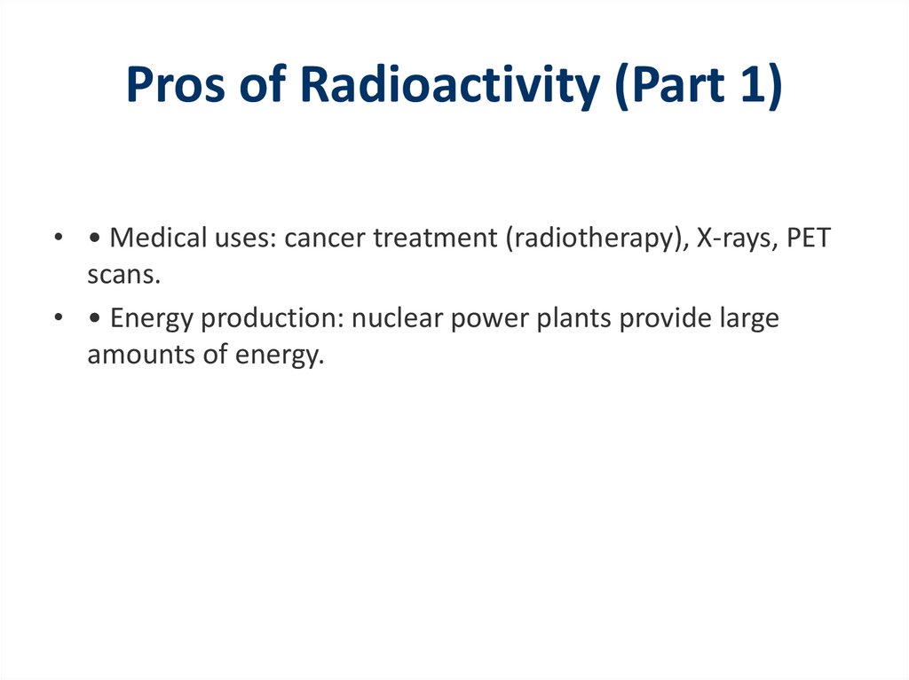 Pros of Radioactivity (Part 1)• • Medical uses: cancer treatment (radiotherapy), X-rays, PET