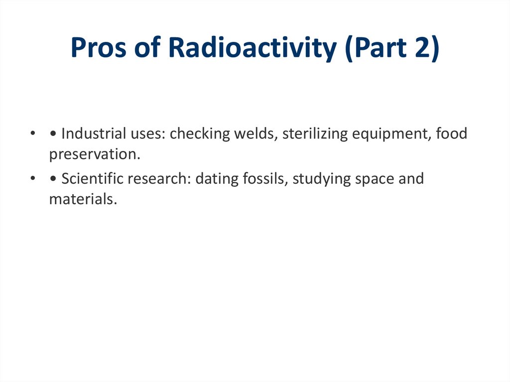 Pros of Radioactivity (Part 2)• • Industrial uses: checking welds, sterilizing equipment, food