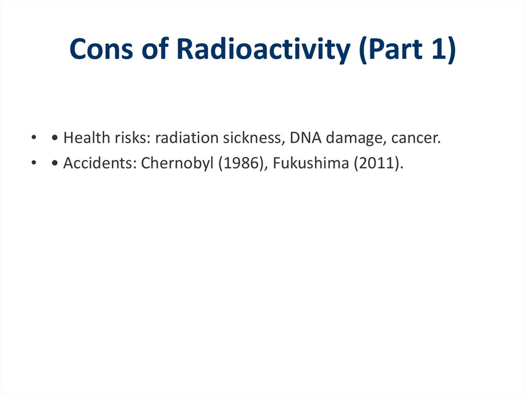 Cons of Radioactivity (Part 1)• • Health risks: radiation sickness, DNA damage, cancer.