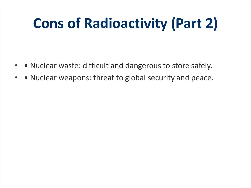 Cons of Radioactivity (Part 2)• • Nuclear waste: difficult and dangerous to store safely.