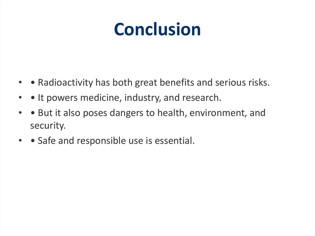Conclusion• • Radioactivity has both great benefits and serious risks.