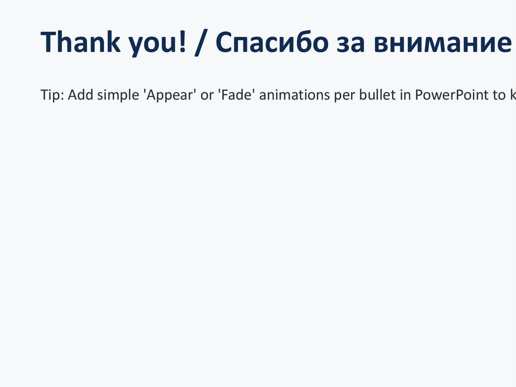 Thank you! / Спасибо за вниманиеTip: Add simple 'Appear' or 'Fade' animations per bullet in PowerPoint to ke