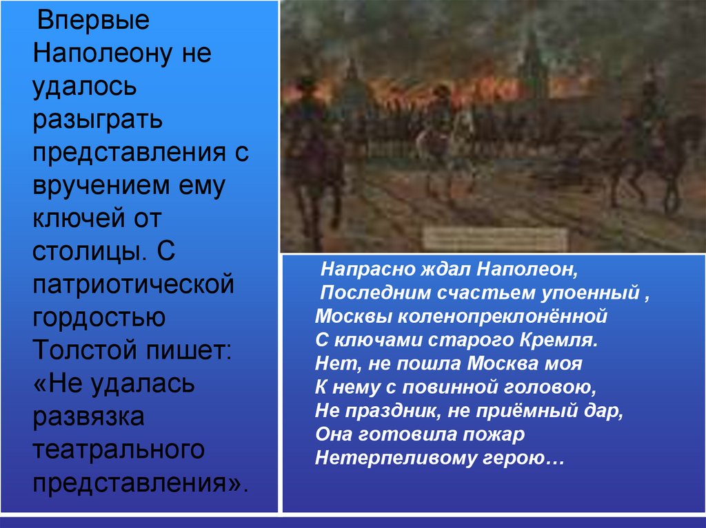 (жители уходят и поджигают Москву); Наполеон входит в