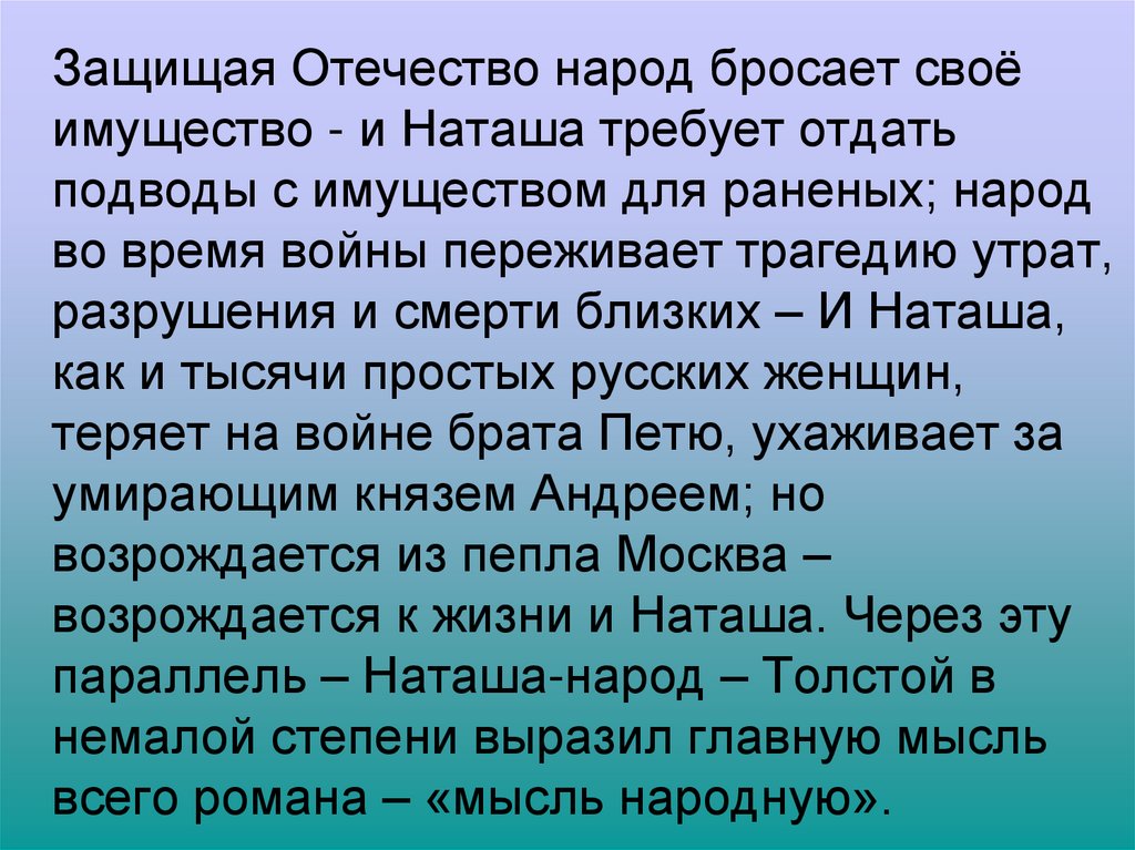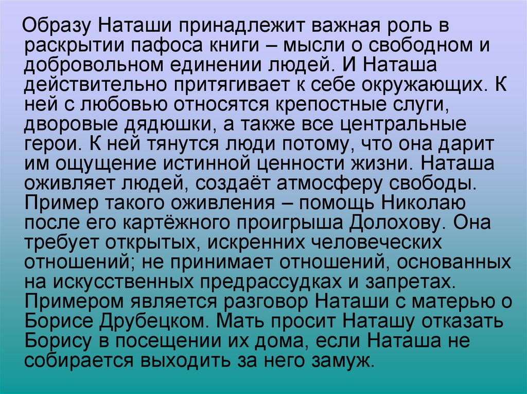 Образу Наташи принадлежит важная роль враскрытии пафоса книги – мысли о свободном и