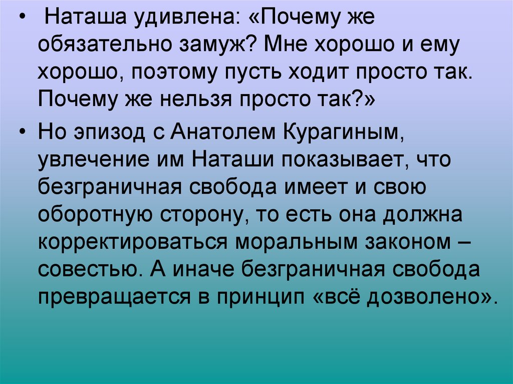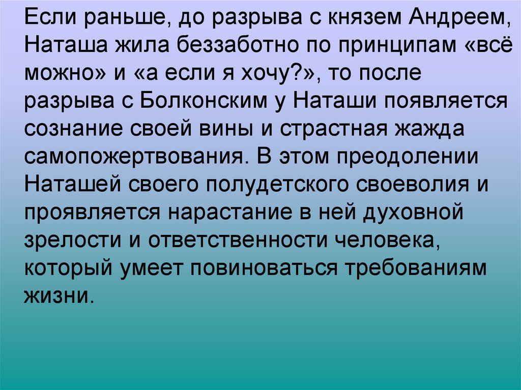 Если раньше, до разрыва с князем Андреем,Наташа жила беззаботно по принципам «всё