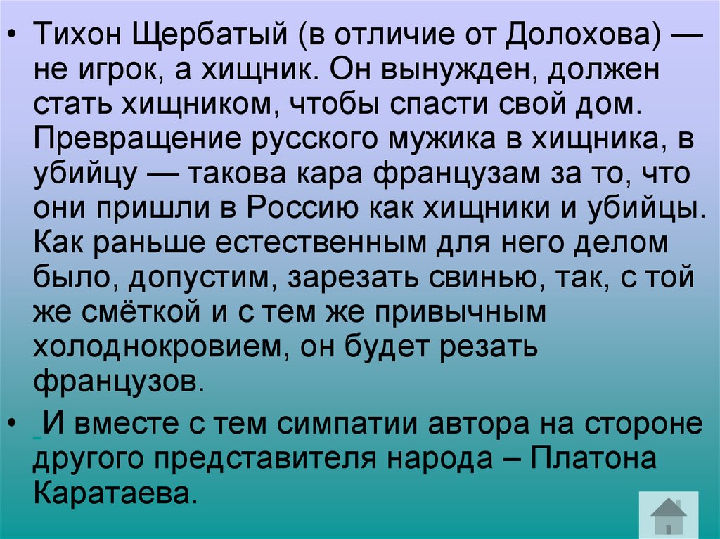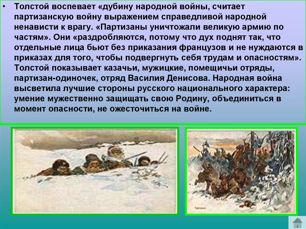 • Толстой воспевает «дубину народной войны, считаетпартизанскую войну выражением справедливой народной