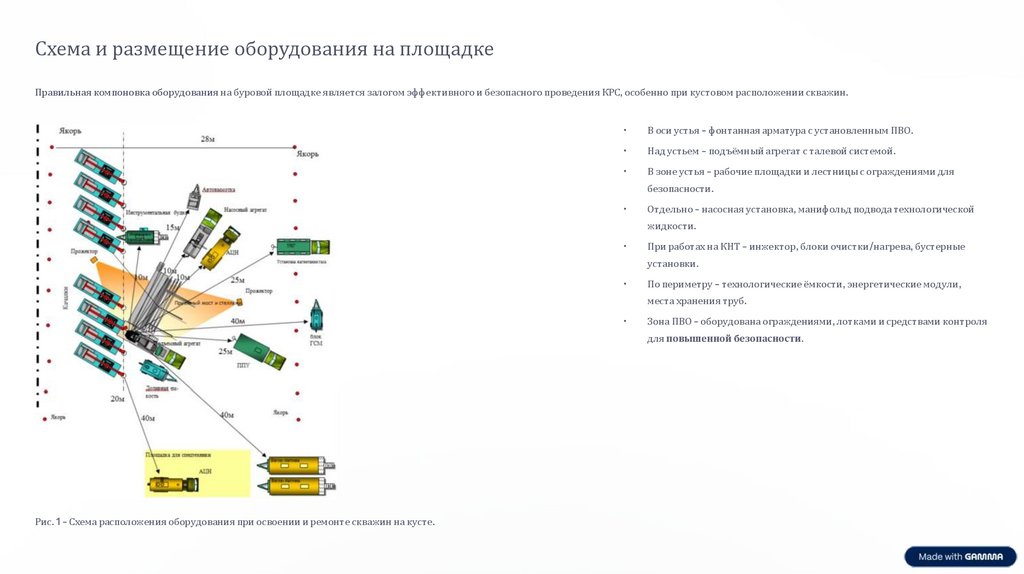 Схема и размещение оборудования на площадкеПравильная компоновка оборудования на буровой площадке является залогом эффективного и безопасного проведения КРС, особенно при кустовом расположении скважин.
