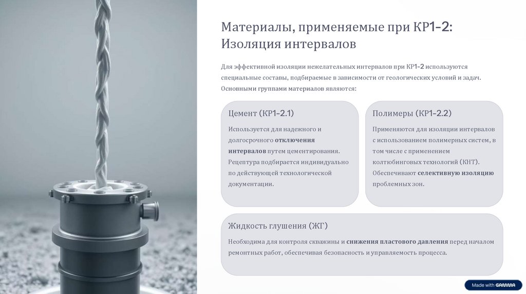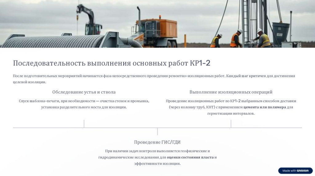 Последовательность выполнения основных работ КР1-2После подготовительных мероприятий начинается фаза непосредственного проведения ремонтно-изоляционных работ. Каждый шаг критичен для достижения