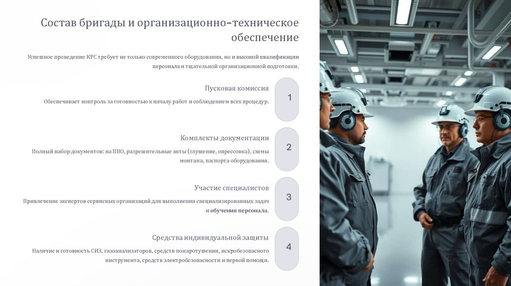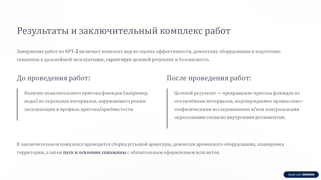Результаты и заключительный комплекс работЗавершение работ по КР1-2 включает комплекс мер по оценке эффективности, демонтажу оборудования и подготовке