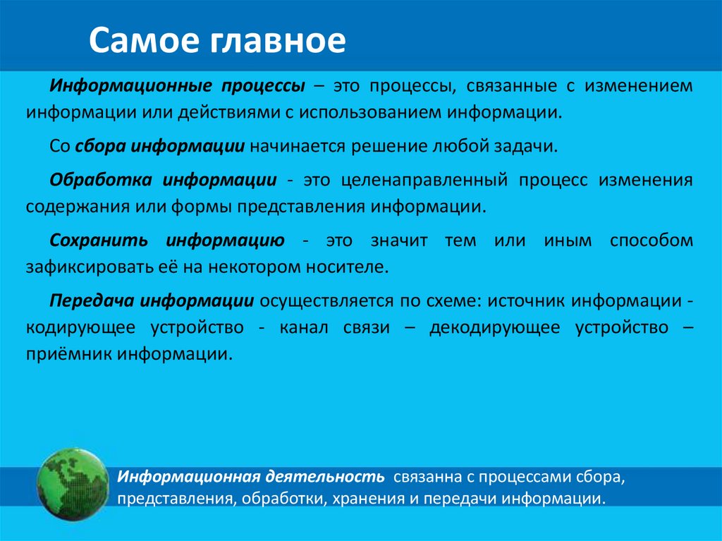 Самое главноеИнформационные процессы – это процессы, связанные с изменением